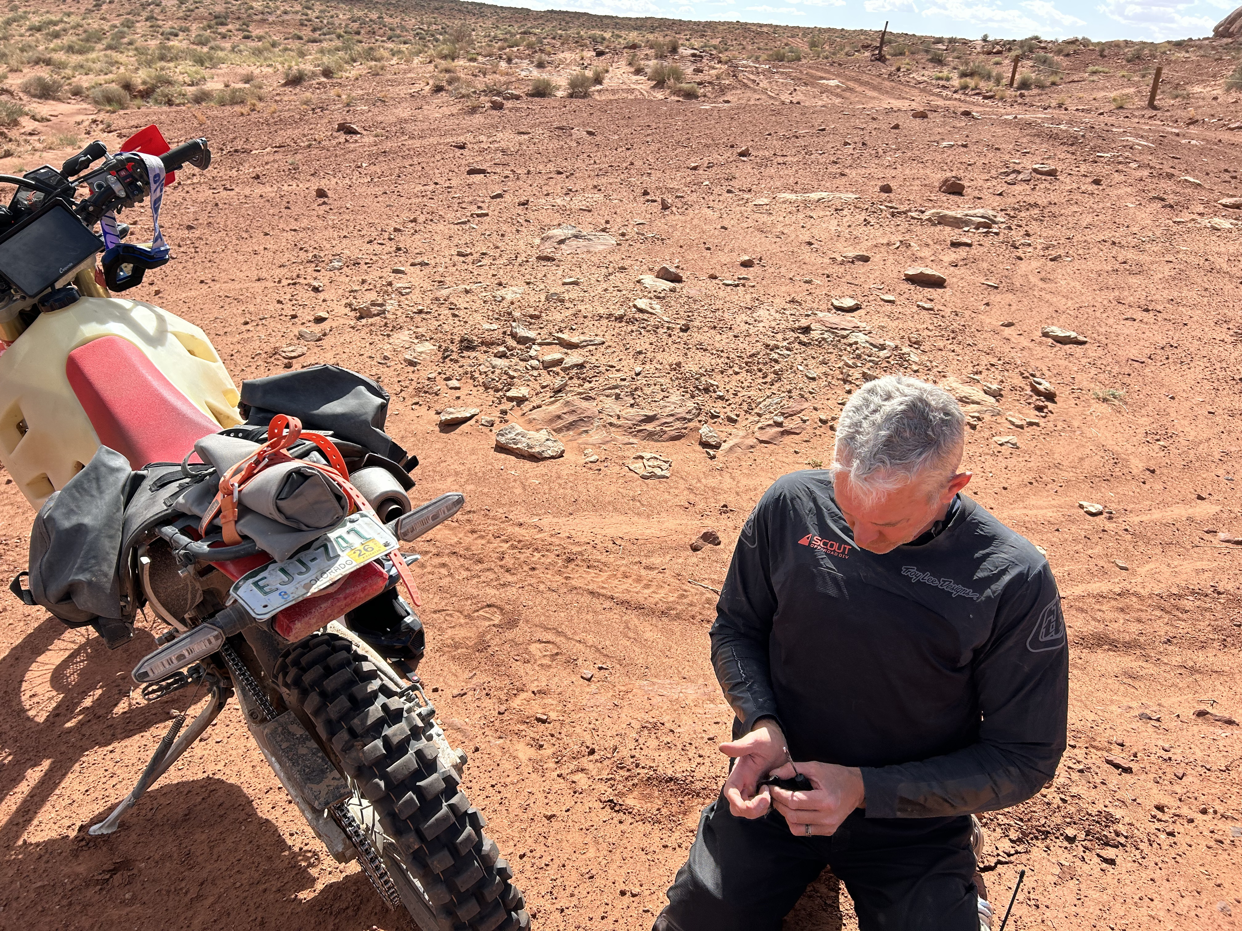 If you donât know the ride, Kokopelli is a 150 miles from Fruita to Moab. It has some pavement and smooth dirt but I would not describe it as that. I would describe it as a long tough day. When the going gets rough, itâs difficult. It starts from Rabbit Valley on a fun dirt road. Then some pavement and back to dirt and I donât recall what else or in what order. It was 7 hours and I was fried at the end. What I do recall was Rose Garden Hill. We came down that son a bitch. I would not go up it. The Sandman and I made it down with lots of butt pucker, but luckily our bikes are over 100 lbs lighter than Coolioâs. Coolio managed to make it with only a broken turn signal. He is such a beast! I do feel the need to mention that big bikes in Moab seems like a really bad idea. Unless you are Coolio, I would ride nothing over 320lbs. You can get in way over your head quickly out there and help is far away. Also big bikes break when you drop them. Sandman and I dropped our bikes so many times and we just pick it up and go.